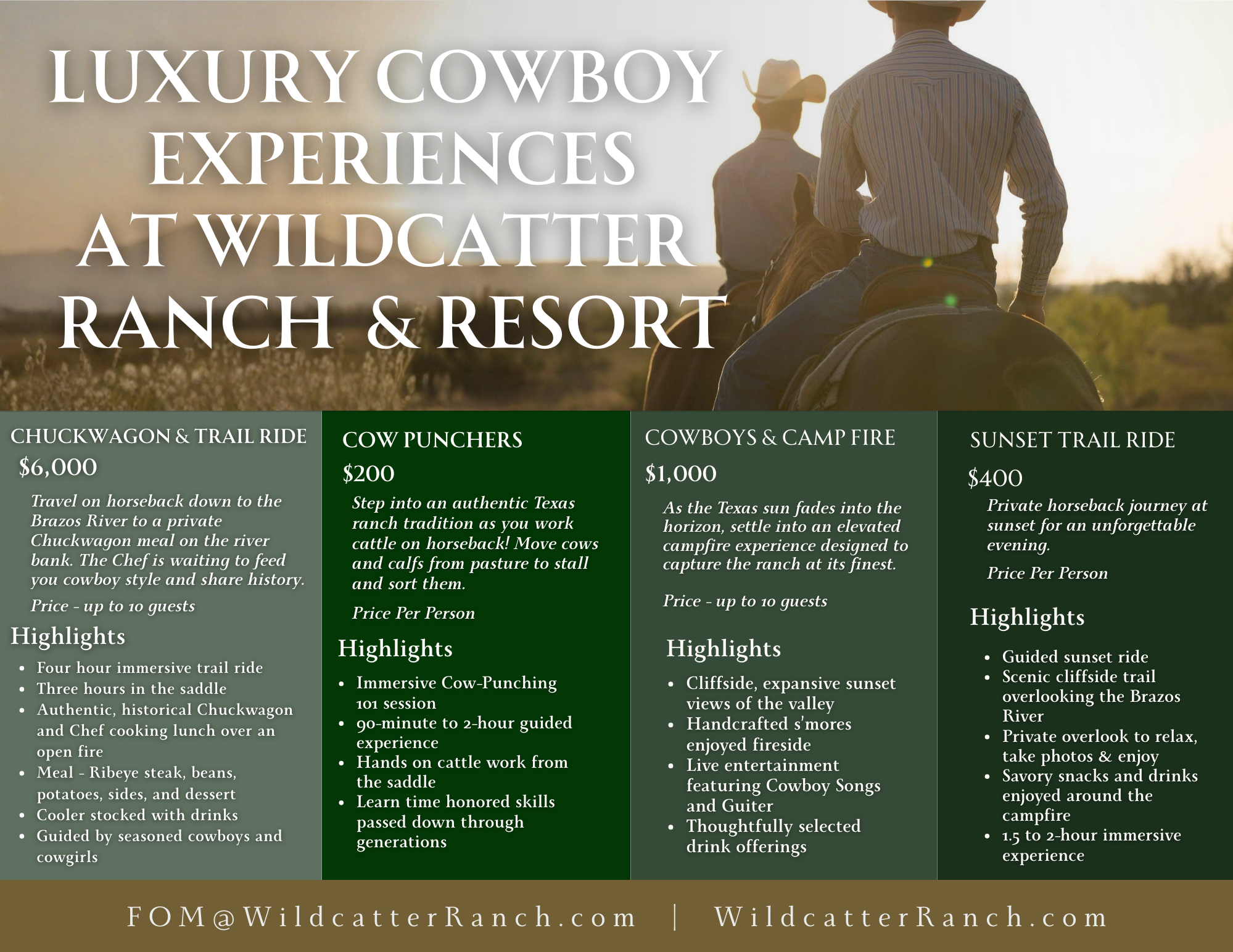 Explore our website to learn more about specific activities, pricing, and availability. Book your experience today and unleash your wild side at Wildcatter Ranch and Resort!