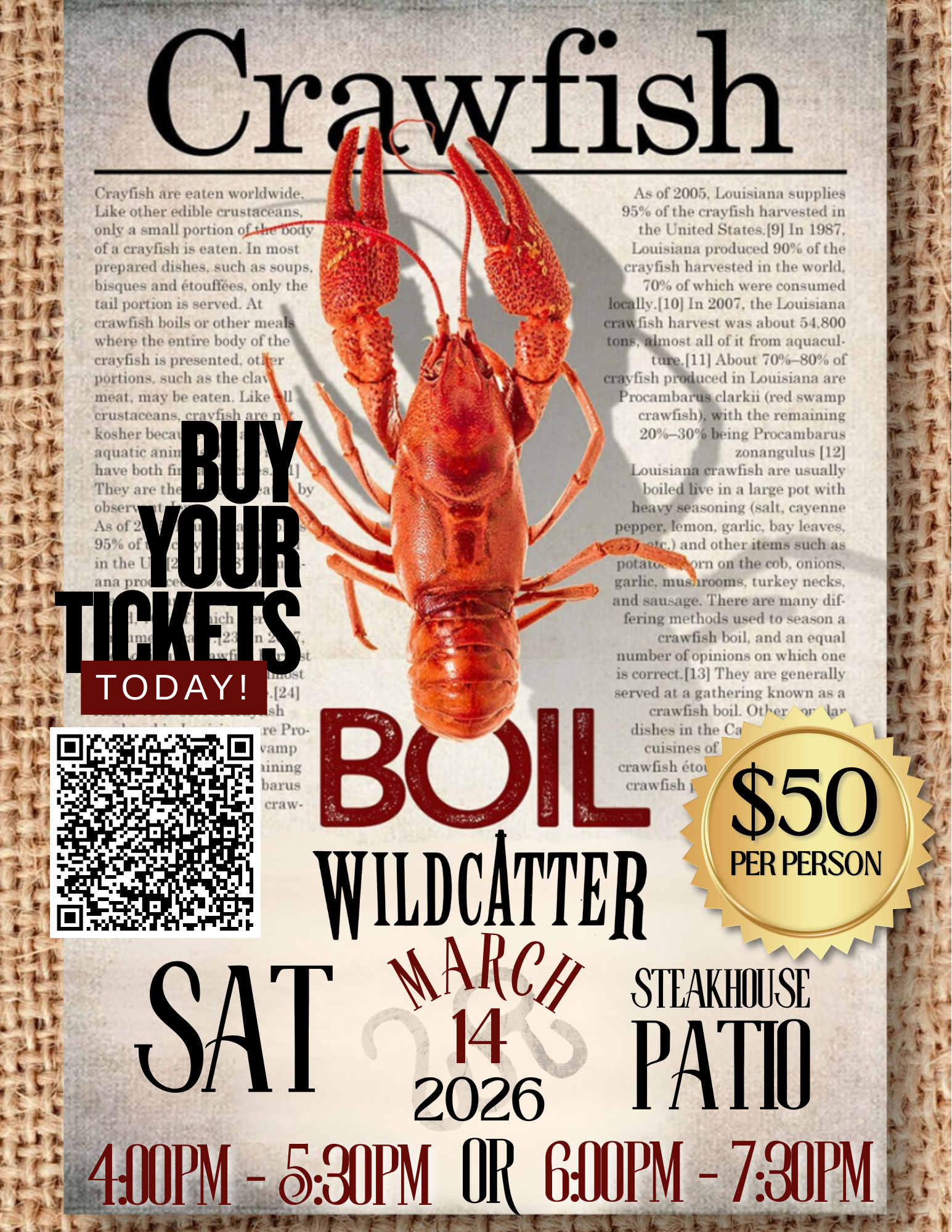 Next food event at Wildcatter Ranch will be Big Patio Crawfish Boil!